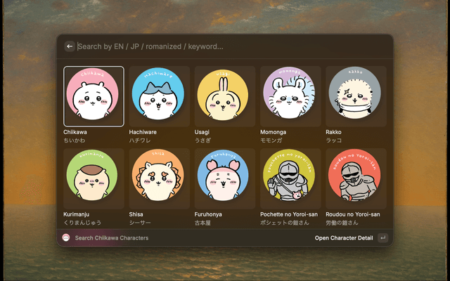Raycast extension for searching and browsing Chiikawa character profiles offline. Character data and "open official page" actions use the official character pages.