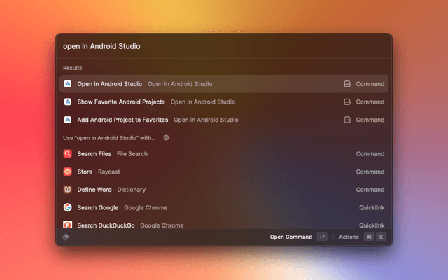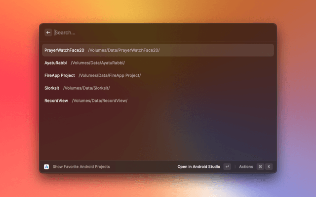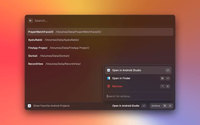 Open current Finder directory, selected folder in Android Studio, Add your favorite projects for quick access.