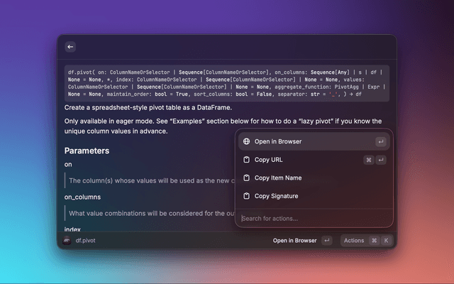 A Raycast extension that lets you search the Polars API reference and preview detailed documentation without leaving Raycast. Results include signatures, descriptions, parameters, and return values, with quick actions to open the official docs in your browser.