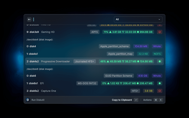 The usage is fairly intuitive. Each disk has multiple actions in Raycast which are self-explanatory and change based on the type and status of the disk/volume. Just try it!