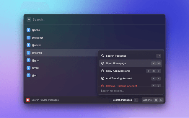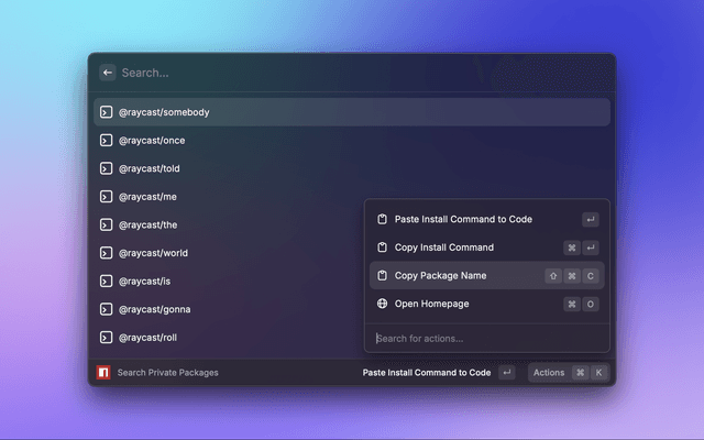 This is a simple tool to search for private npm packages in a given directory. It will search for the packages under a user or organization account. For example, if you have a private npm package under the @raycast organization, you can search for it using this tool.