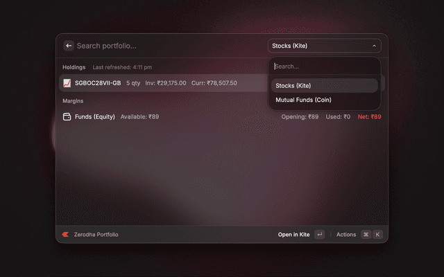 Open Raycast, search for "Zerodha Portfolio", and see your: