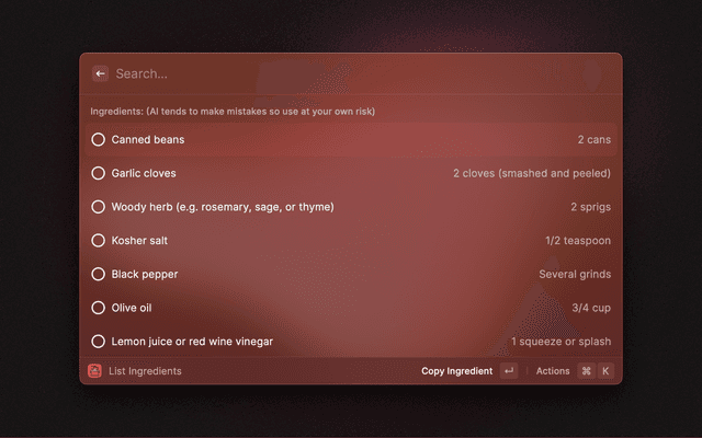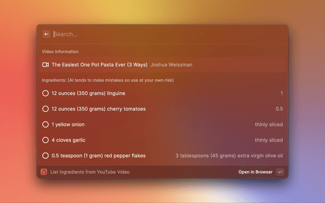 After using a youtube video's URL to get it's transcript or getting the contents of an entire website using selected text, you will receive a list of every single ingredient necessary in your recipe from online followed by it's quantities using Raycast's built-in AI.