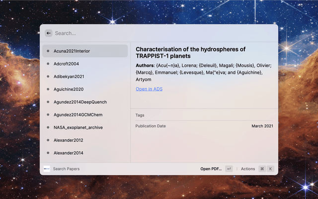 Extension for quickly accessing your bibmanager database from Raycast. Search the database (by bibkey, author, title, year or tags) and quickly access entries by opening or downloading the pdf. You can also open or copy the ADS link and copy the bibtex entry. Make sure to explore available actions in the action panel (⌘ + K).