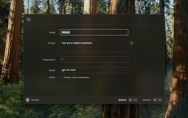 GPT-5 model supports vision capabilities, which can be enabled in the Models Command when creating or editing a model. You can also enable per-model reasoning control in the model form and set the Effort (none, low, medium, high). By default, reasoning effort override is disabled. When it is enabled and set to anything except none, the extension sends reasoning_effort in Chat Completions requests.
