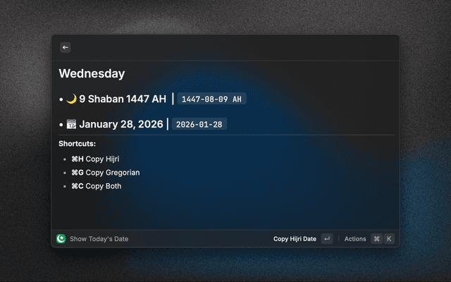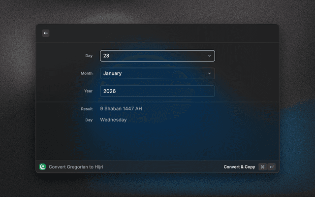 Convert dates between Hijri (Islamic) and Gregorian calendars directly from Raycast.