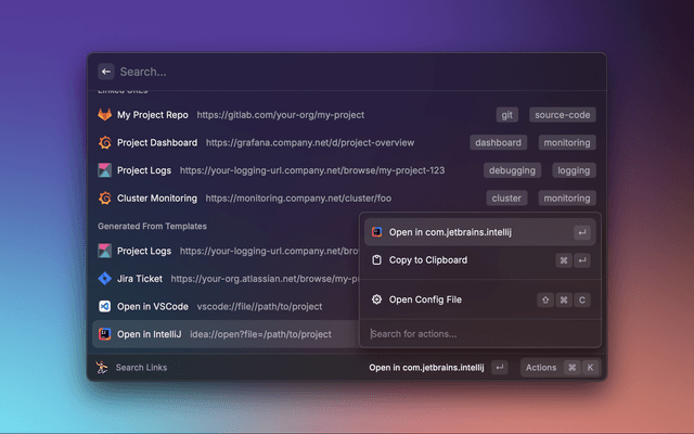 Quick Jump is a Raycast extension designed to give you and your team quick, organized access to all your essential project links. With Quick Jump, you can build a config file for your Git repositories, dashboards, databases, and internal tools, accessible with just a few keystrokes.