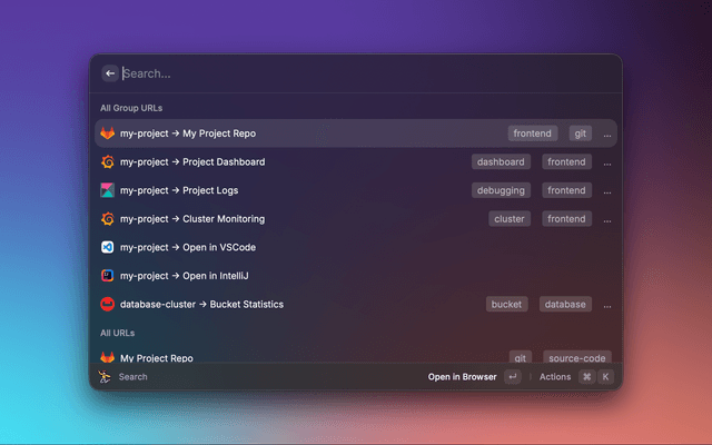 templatePlaceholders defined in individual groups or URLs. Perfect for common values like domain names, cluster names, or environment-specific settings.linkedUrls), define group-specific URLs (otherUrls), apply templates, and define its own placeholder values. Each group can have an optional title for display purposes (if not provided, the group key is used as the title). URLs in otherUrls can have their own titles, icons, tags, and openIn applications.title for display purposes (if not provided, the URL key is used as the title). URLs also support the openIn field to specify which application should open the URL.${placeholder} will be replaced by values from globalPlaceholders or templatePlaceholders defined in the group or URL (with local values taking precedence).appliedTemplateGroups property.The extension comes with a set of predefined PNG icons for common services and tools. You can reference these icons by their filename in your JSON configuration.
