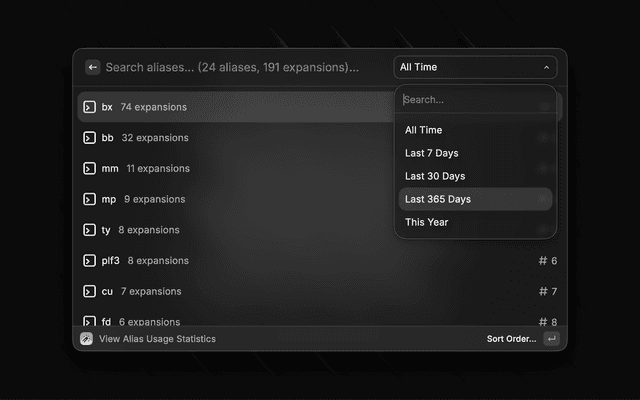 • Usage Statistics: Track how often you use each alias. View your most used aliases, total usage counts, and sort by frequency or name using the View Alias Usage Statistics command.