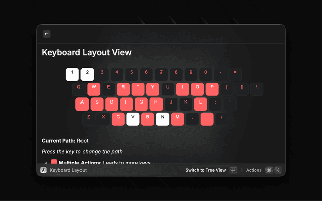 • Aliases Cheatsheet: Visualize your aliases in two formats: an interactive Keyboard Layout View (locked to brand-dark theme) to see your prefix keys at a glance, and a hierarchical Tree View for recursive navigation.