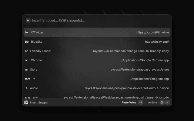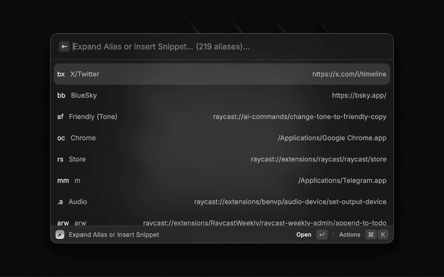 • Everything is a snippet: You can use a prefix to trigger snippet mode for any alias. For example, you can type rw to open https://raycastweekly.com/, or type ,rw To insert the link to the currently open application.