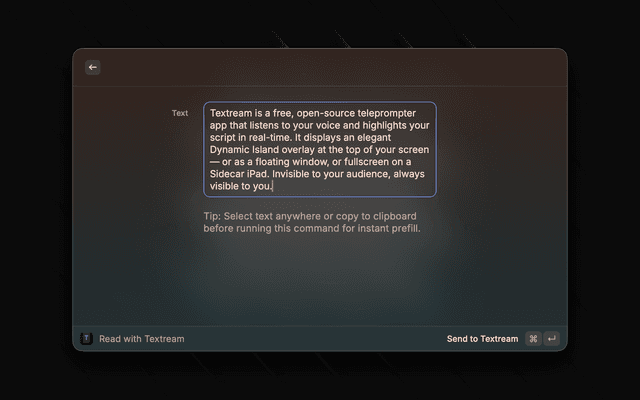 Raycast extension for Textream — a free macOS teleprompter app for streamers and presenters.