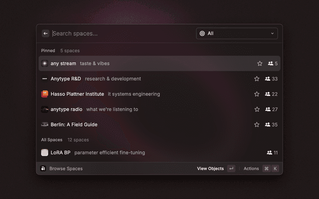 - Open: Use Command+Enter to instantly open the currently selected space or object in Anytype.