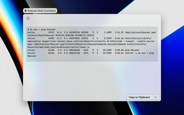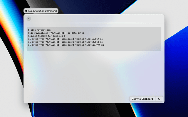 Execute shell commands from Raycast on macOS and Windows. Run commands inline or toggle the Use External Terminal preference to open them in iTerm/kitty/Warp/Ghostty on macOS or in PowerShell, PowerShell 7, or Command Prompt on Windows.