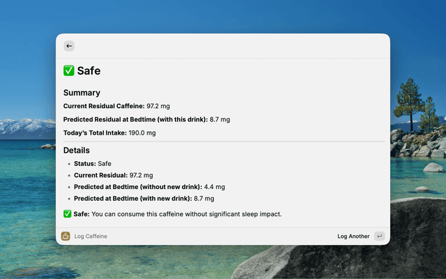 | Today's Caffeine | View history, current residual, and predicted bedtime levels |