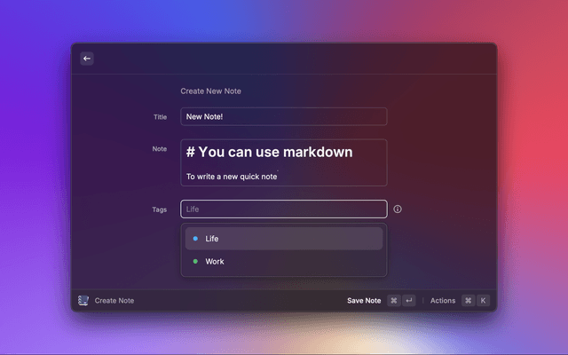 β + N - Create a new noteβ + β§ + C - Copy note body^ + β§ + X - Delete a noteβ + T - Quick apply / remove tagβ + β§ + T - Create a new tagβ + F - Filter by tag^ + β§ + T - Delete tagsβ + M - Toggle note metadataβ + S - Sort notesβ + I - Summarize note with AIβ + β§ + I - Clear AI summaryCreate Note