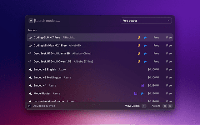 Filter models by price tier (free, under $1/M, under $5/M, etc.) and sort by cost. Estimate costs for different token counts.
