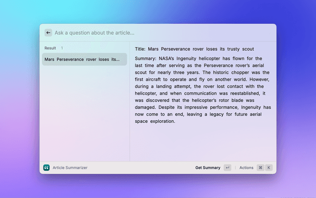 This Raycast extension offers a versatile tool for interacting with a wide range of web articles by generating concise summaries and enabling interactive dialogues with the content. It integrates AI capabilities to assist with everyday inquiries and tasks, now with support for the ChatGLM API.