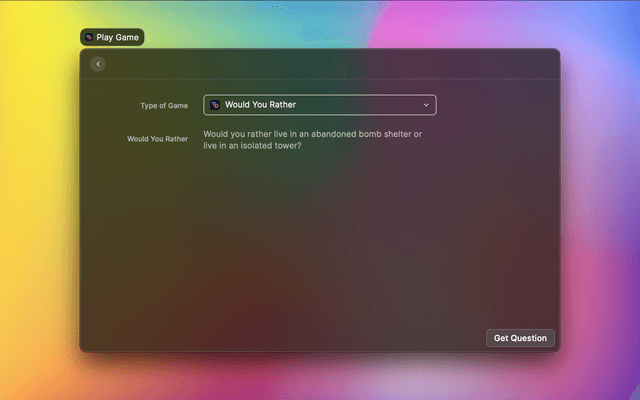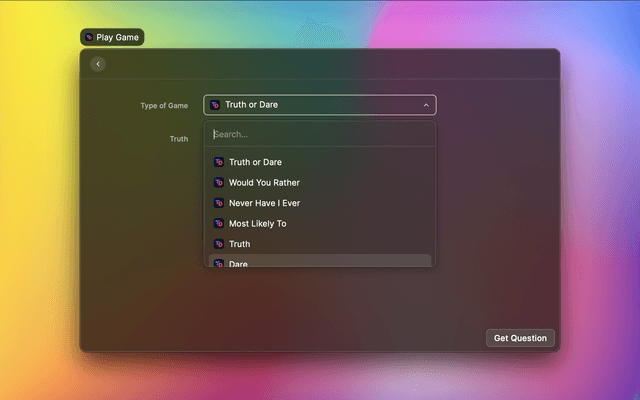 Get a random Truth or Dare, Would You Rather, Never Have I Ever, or Paranoia question! Powered by https://truthordarebot.xyz