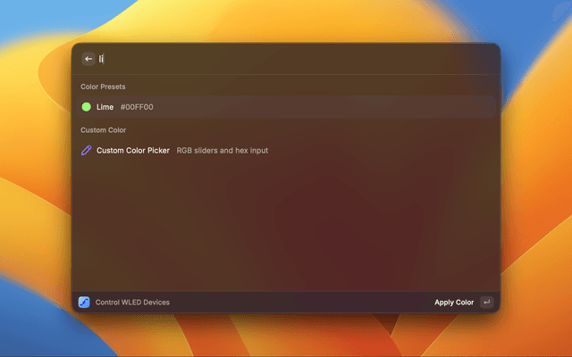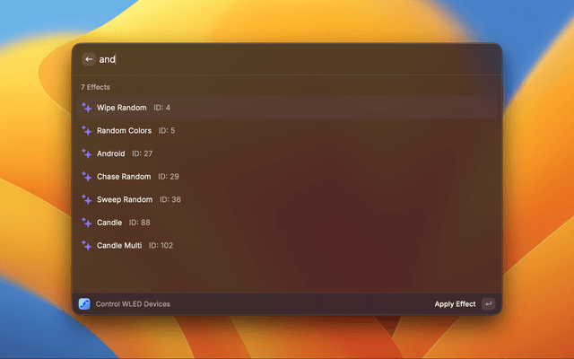 Control your WLED LED strip devices directly from Raycast. Manage multiple devices, adjust colors, brightness, and apply effects with a simple, unified interface.