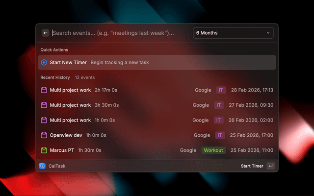 - Start a timer from any existing calendar event (updates the original event on stop)