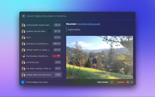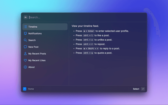Browse through your Bluesky timeline. Create new posts, find people, and view your notifications. All from Raycast.