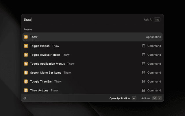 Control Thaw directly from Raycast. Toggle visibility sections, search menu bar items, and open settings without touching your mouse.