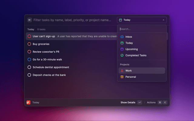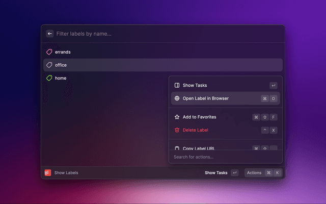 Home command and select your view in the dropdown (e.g All Tasks or a specific project)Create View Quicklink in the actions (⌘ + K).⌘ + ⏎).This makes it easy to access any of your views, including projects and labels!