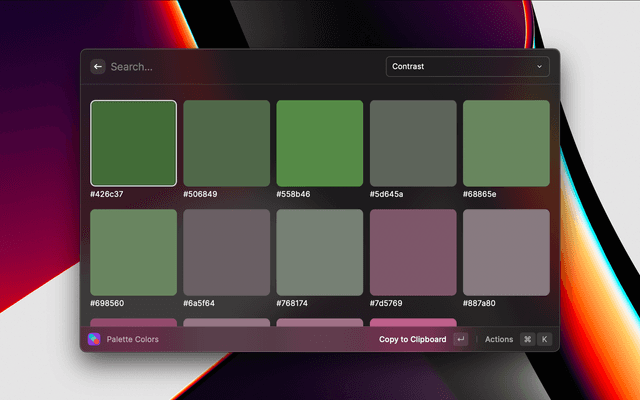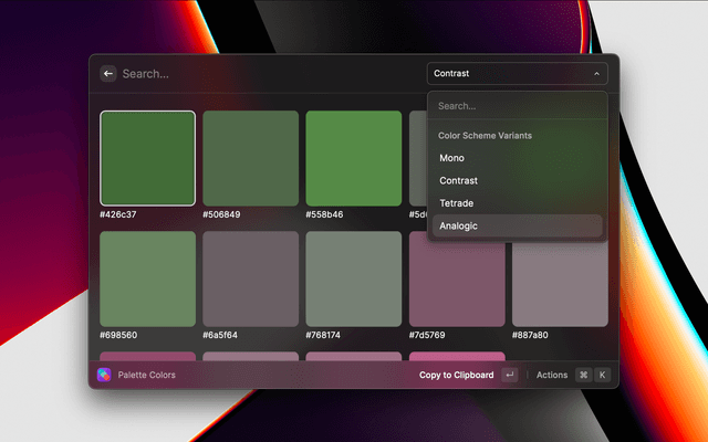 This extension generates a random color palette based on a color scheme variant. You can pick a color and it will be copied to your clipboard.
