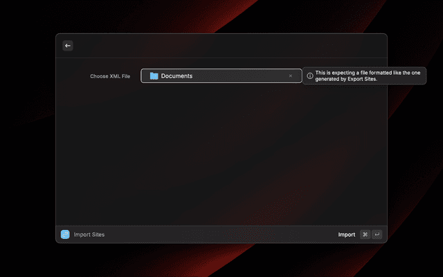 The first time you open the extension you will be asked to choose an XML folder, this defaults to your Documents folder. This folder is used by the “Export Sites” and “Import Sites” commands. It’s where exported XML files are saved and the default import directory.