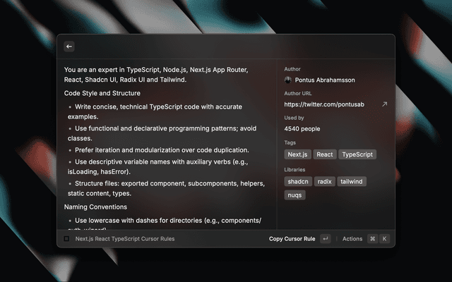 Cursor Directory is a powerful Raycast extension that seamlessly integrates with cursor.directory, allowing users to access, search, and utilize cursor rules directly within the Cursor Code Editor. This extension streamlines the process of finding and implementing cursor rules, enhancing productivity for developers using the Cursor IDE.