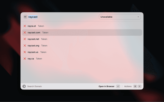 Sign up at Fastly if you don't have an account. You'll be required to provide a valid credit card number.Navigate to Domain Research APIClick "Enable" and then "Purchase Now" to enable the API (first 10,000 requests/month are free).Enable 2FA on your Fastly account (required to create API tokens)Navigate to API Tokens (you may need to reauthenticate)Click "+ Create Token"Enter a name, e.g. "Raycast"Enter this token in the extension's Preferences or at the first promptThis extension previously used the Domainr API via RapidAPI.