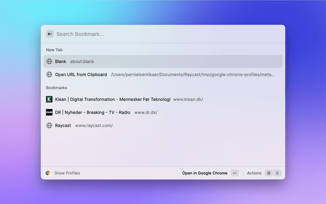 Hit Enter ↵ to enter a profile's bookmarks, or ⌘ ↵ to open (or focus) the profile chrome window.
