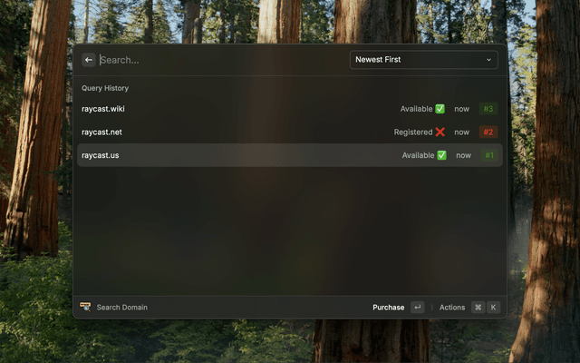 This extension only sends domain names to the API for checking availability. No personal data is collected or stored outside of your local Raycast environment.