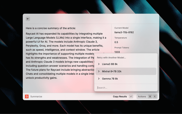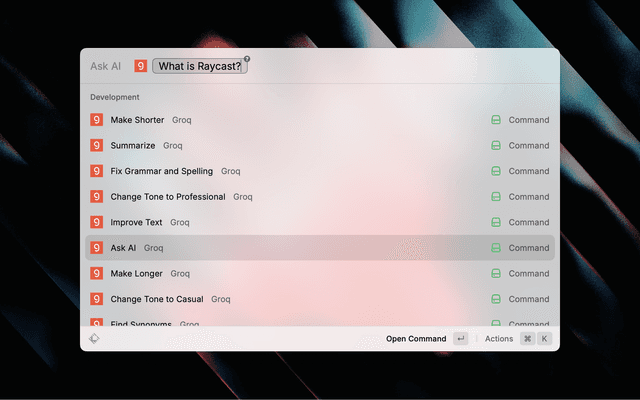 Groq's API offers a wide range of AI models, such as Mistral, Google and Meta's Llama models, with insanely fast speed (Llama3 70B with over 250 t/s). With this powerful extension, you can boost your productivity using advanced AI models without having to leave your Raycast interface.