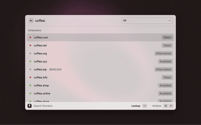 The fastest domain name search tool on the internet, now available as a Raycast extension. Search for available domain names instantly with real-time results powered by instantdomainsearch.com.
