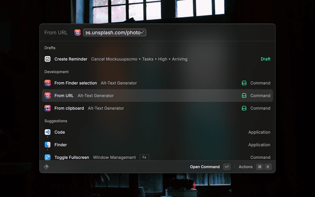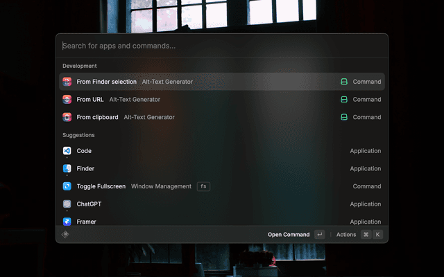 From File Selection: This command will generate alt-text from a single file selection in Finder. Supported image types and file sizes are set by the OpenAI API. For more information, refer to the OpenAI API Vision documentation