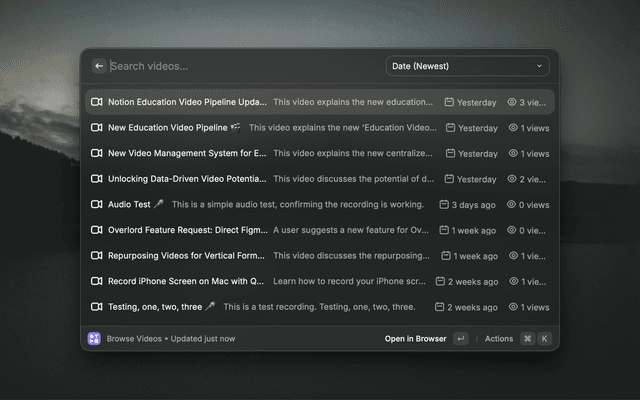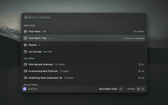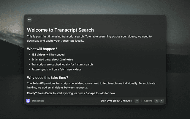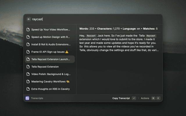 Use Tella inside Raycast to browse videos, manage playlists, search transcripts, and query your content with AI Chat.
