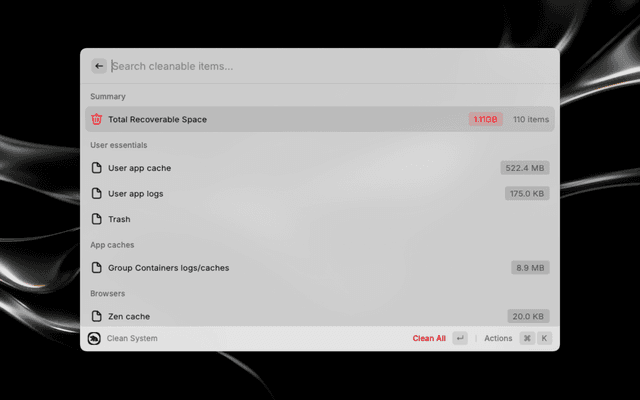 | Clean System | Preview and remove caches, logs, and temporary files with streaming progress |