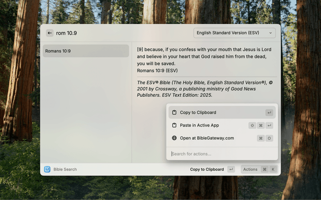 Instant access to the Word of God, right from your Raycast command bar. Search, read, and share Bible passages with speed and convenience.