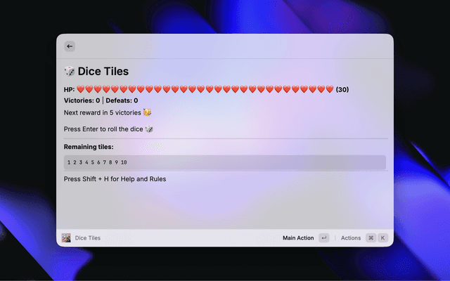 Dice Tiles is a fun and challenging game you can play directly in Raycast. Roll dice, select tiles to match the sum, and clear all tiles to win. Earn victories to unlock new rewards, see your life bar evolve, and reach higher achievement tiers.