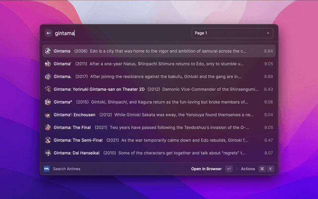 In the list view, you can toggle between simple and detailed views with the action "Cmd+Enter". Navigate through the results with the pagination! When search bar is empty, it will show you the seasonal animes. NSFW animes are hidden by default but you can toggle their visibility in the settings.