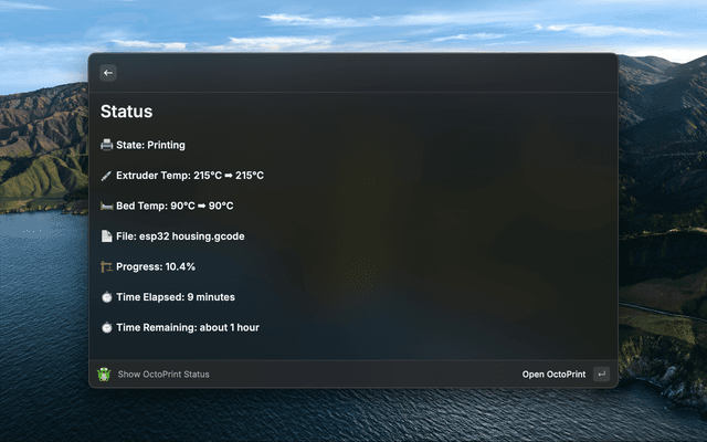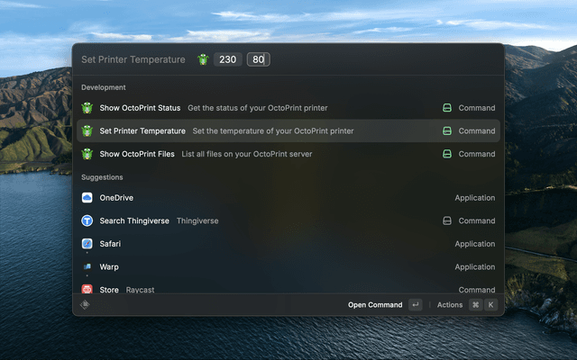 This Raycast extension allows you to control your 3D printer through OctoPrint - from Raycast.