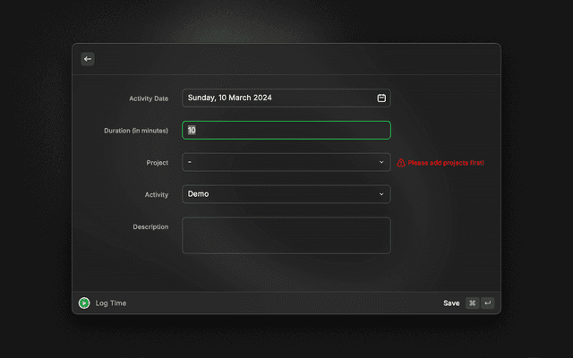 This Raycast extension lets you quickly add new time log to Kimai and view amount of hours logged today in menu bar.