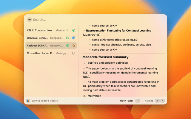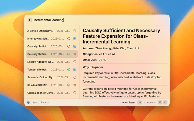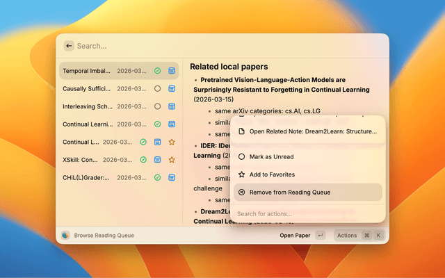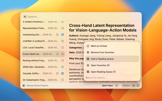 Today PapersBrowse today’s papers from your local library. Detail view: title, authors, abstract, “Why this paper,” optional research summary. Actions: open paper/note, related papers, mark read, favorites, reading queue.