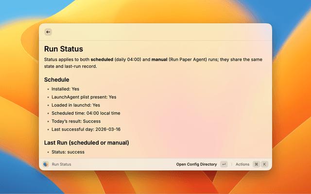 • Daily schedule not running / today's 04:00 didn't run — The 04:00 run only fires if the Mac is awake at 04:00. If the Mac was off or asleep, no run occurs. Catch-up runs only when the LaunchAgent is loaded: at user login (after reboot or logout/login) or when you run Install Daily Schedule. Opening Raycast or the extension does not load the agent, so it does not trigger a catch-up. If "Today's result" is still "Not run yet", run Run Paper Pipeline manually for today, or log out and back in / re-run Install Daily Schedule to trigger a catch-up. After changing Preferences that affect the pipeline, re-run Install Daily Schedule and use Check Run Status to confirm install state and latest run metadata. To verify whether launchd ever started the job today, check ~/Library/Logs/PaperAgent/launchd.stdout.log and launchd.stderr.log for today's date.