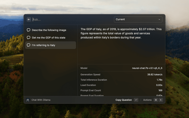 Ollama installed and running on your mac. At least one model need to be installed throw Ollama cli tools or with 'Manage Models' Command. You can find all available model here.