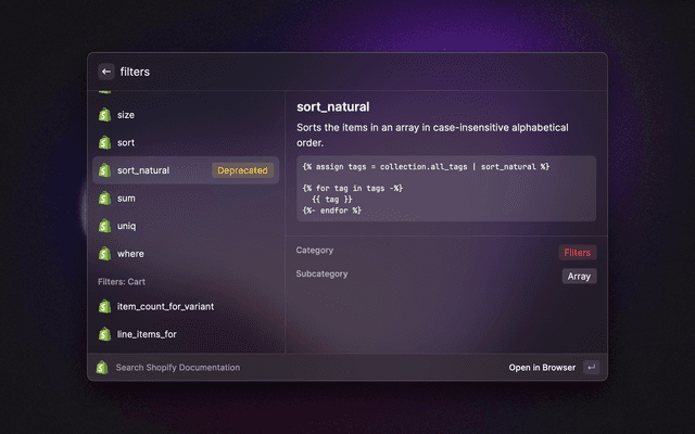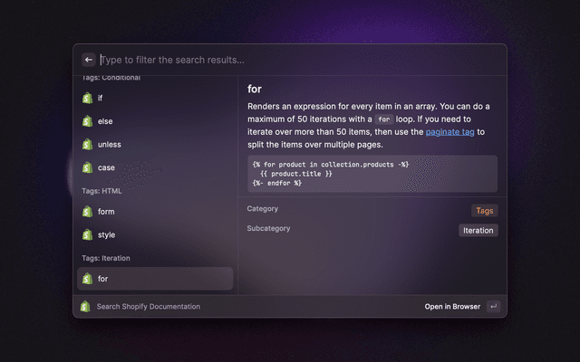 Search Shopify Liquid Documentation Directly From Raycast
