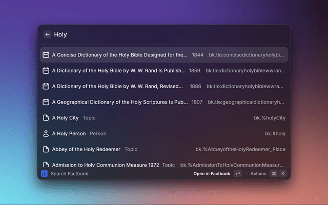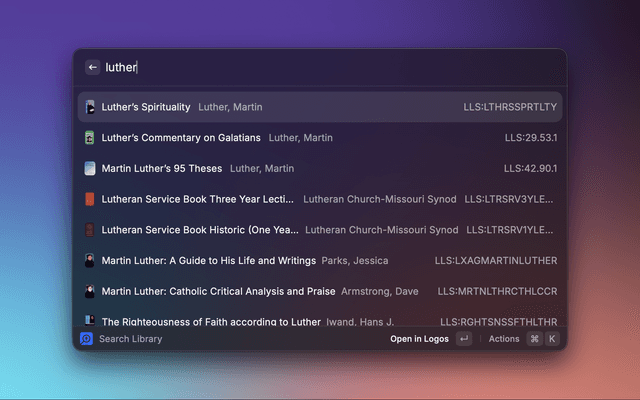 - Results are fetched live (type ≥2 characters) so updates in Logos become available instantly after reloading the database.