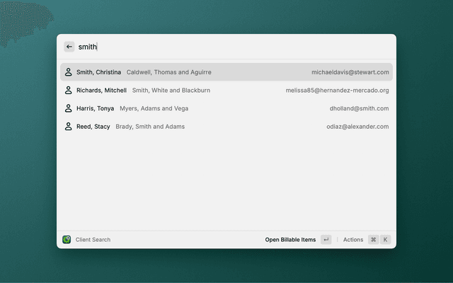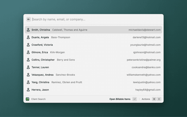 Search your WHMCS Clients and quickly access the client's profile, billable entries, and more.